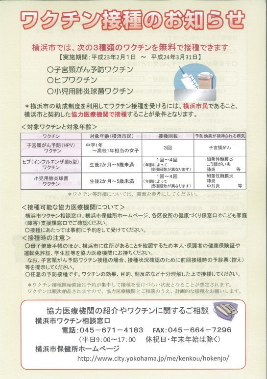 岡本こどもクリニック Hibワクチン 肺炎球菌ワクチン 横浜市の助成により無料接種 (当院では子宮頸がんワクチンは行っておりません) 横浜市では、平成23年2月1日〜平成24年3月31日まで Hibワクチン、肺炎球菌ワクチンの無料化が決定いたしました。 いずれも横浜市に住所のある生後2ヶ月〜5才未満が対象となります。 詳しくは下記をご確認のうえ、お問い合わせください。
