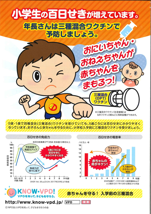 | 【年長さんの三種混合ワクチンについて】 1才半までに4回の4種混合ワクチンで獲得した百日咳の抗体価が、5.6才で低下していることが近年の研究でわかってきました。 学童期の百日咳が問題になってきています。 このため、年長さんのMR2期と同時に、自費になりますが、三種混合ワクチンの追加接種をお勧めいたします。 百日咳は、低月齢の赤ちゃんがかかると重症化する危険があり、赤ちゃんは生後3ヶ月で4種混合ワクチンを受け始めるまで百日咳に関しては無防備な状態です。 このため、下のお子さんのご出産予定がある場合は、MRの時期に合わせず、4才以降での接種をお勧めします。 なお、日本では、海外で使用されているTdapワクチンならびに乳児以外への4種混合ワクチンの接種は認められていないため、「三種混合ワクチン」の接種となります。 また自費ワクチン在庫管理のため、予約は当面WEBではなく電話もしくは窓口での予約となります。 MRと同時接種をご希望の方は、WEBでMRをご予約の上お電話いただくか、もしくは直接お電話で「MRと三種混合希望」とお伝えいただくようお願いいたします。 |